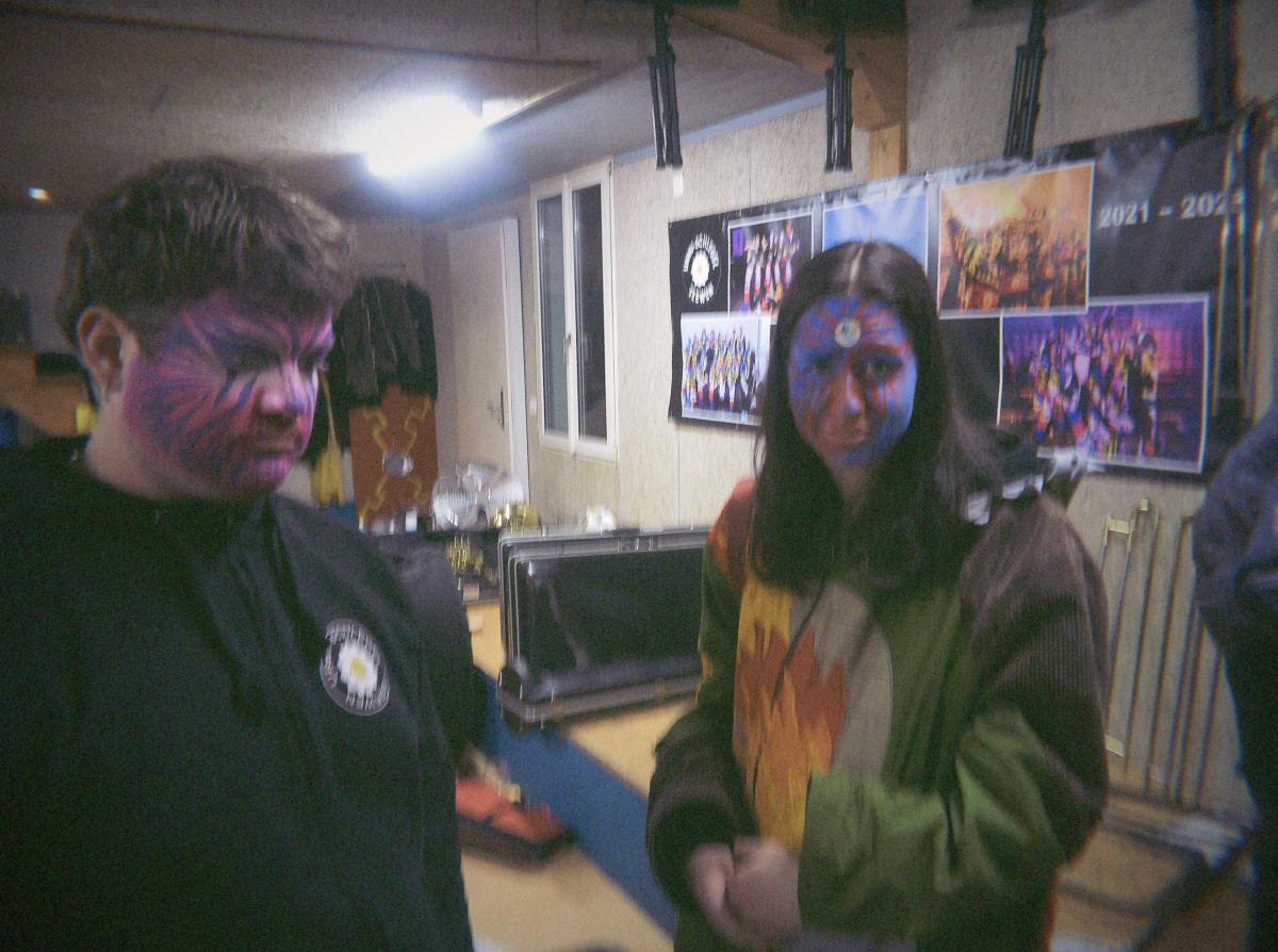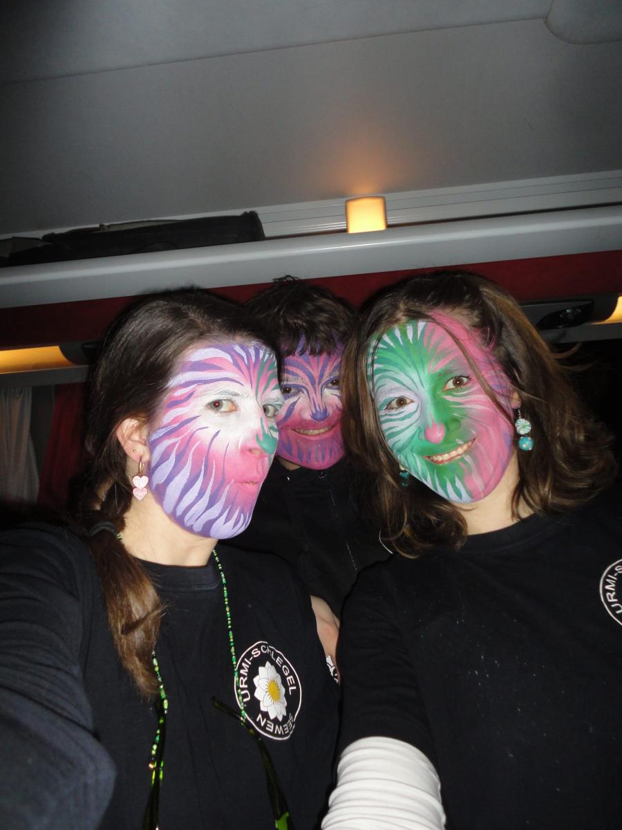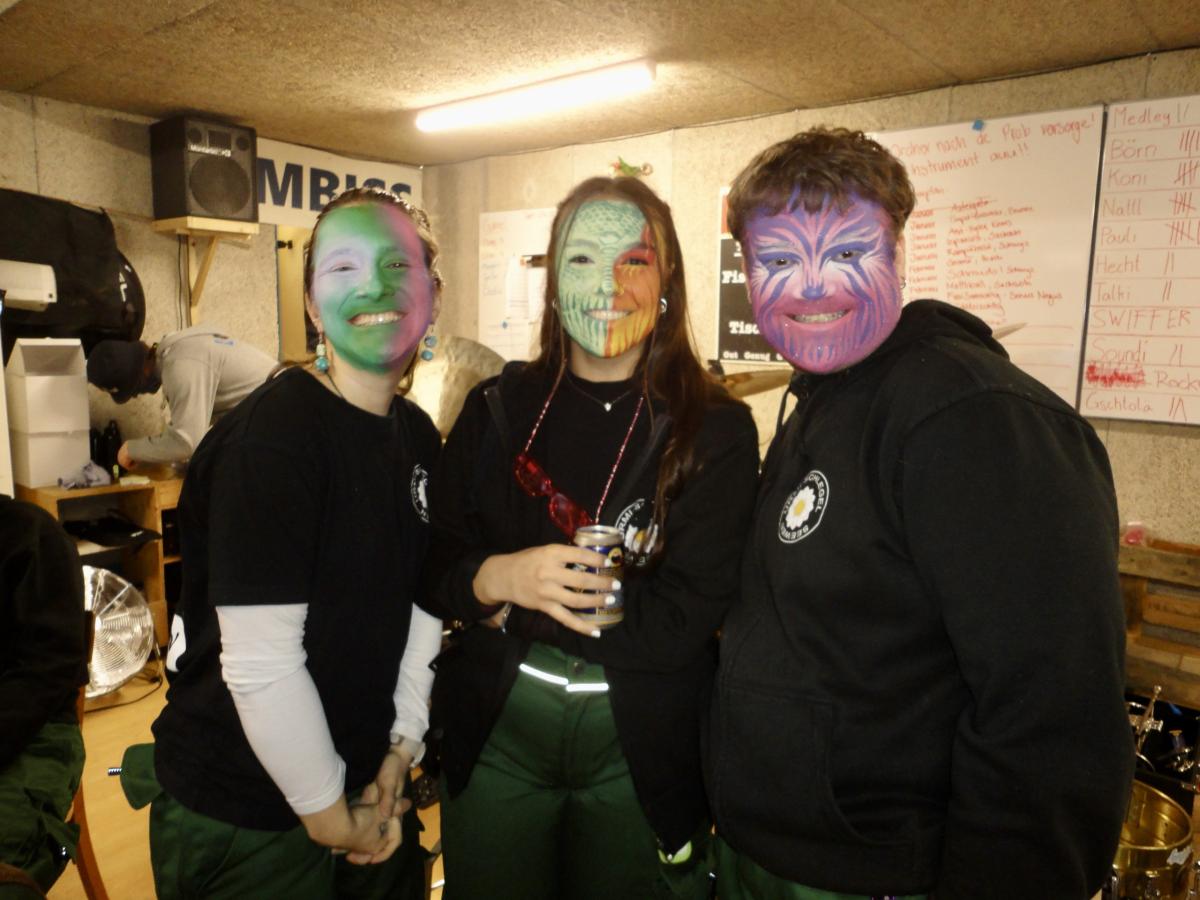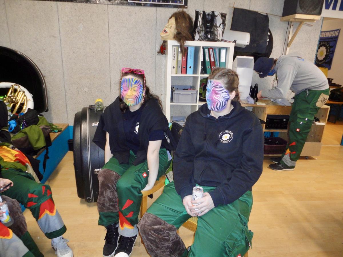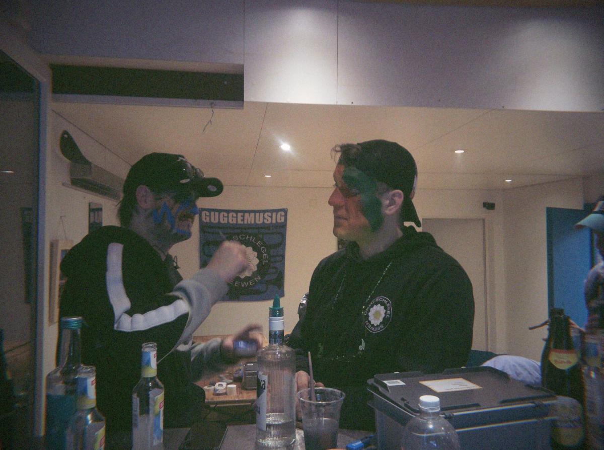 Das Urmi-Volk traf sich also früeh im Proberaum, versorge die Leber mit ordentlich Klang Wasser und schmierte sich mehr oder weniger euphorisch unsere geliebte Farbe in die Visage. «Wele Dubel hed erfunde das Guggene sich mönd Schminke?»