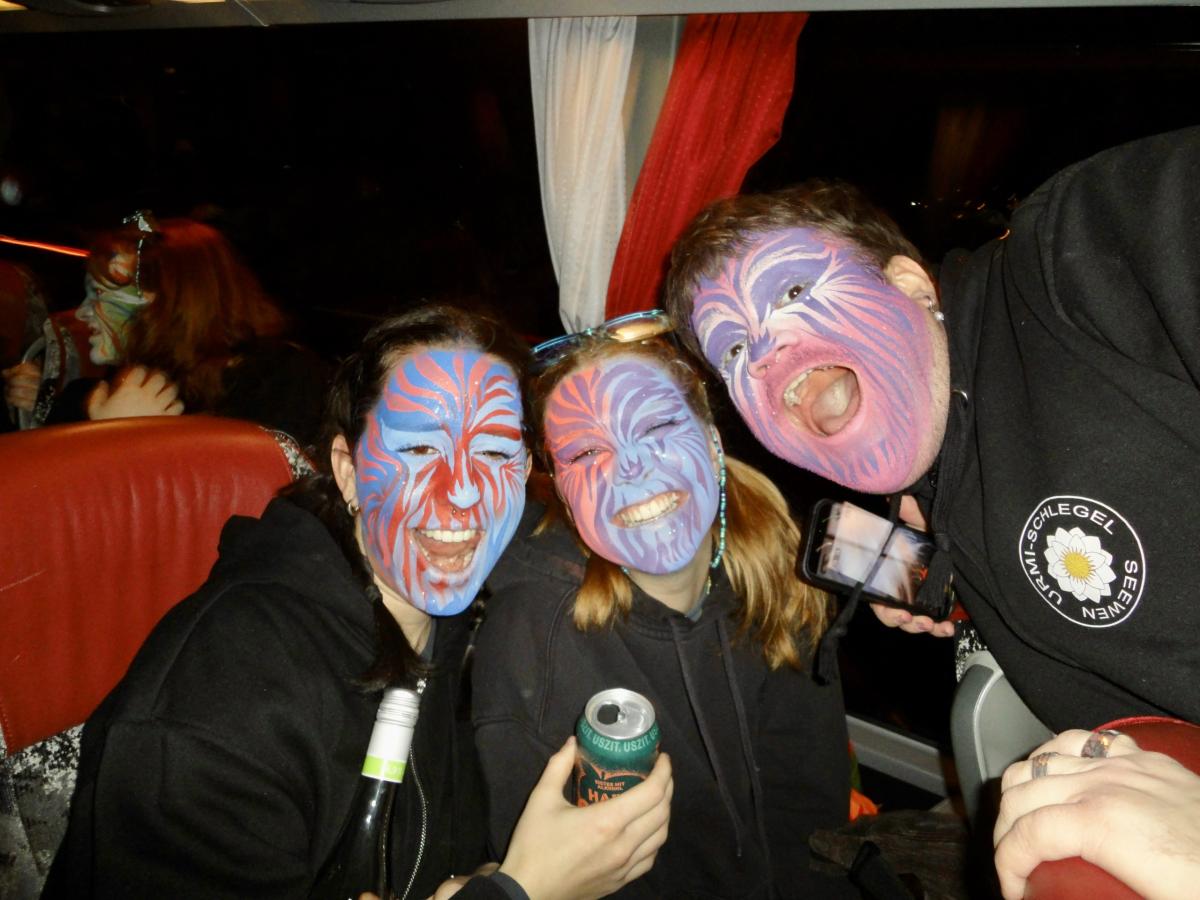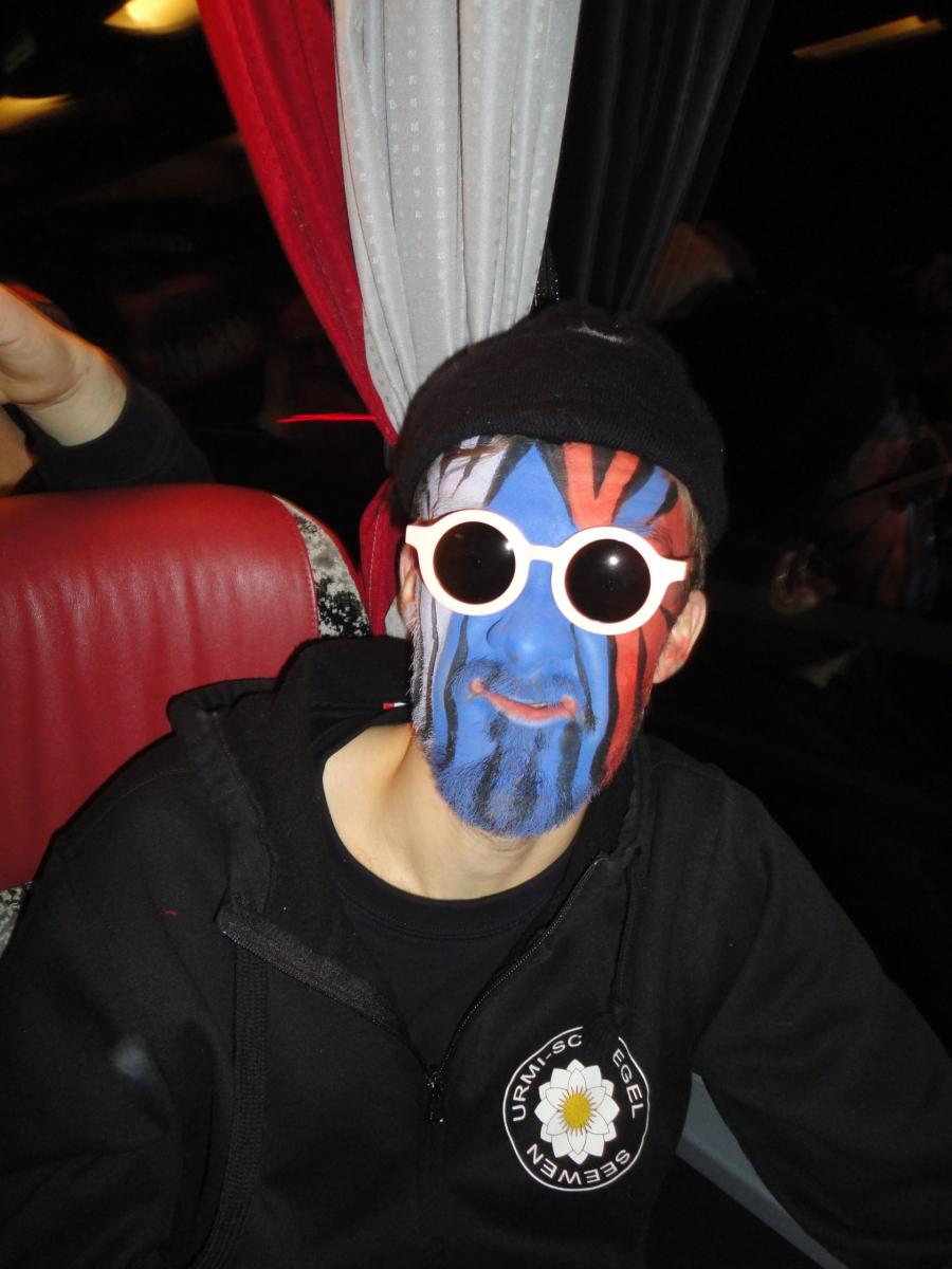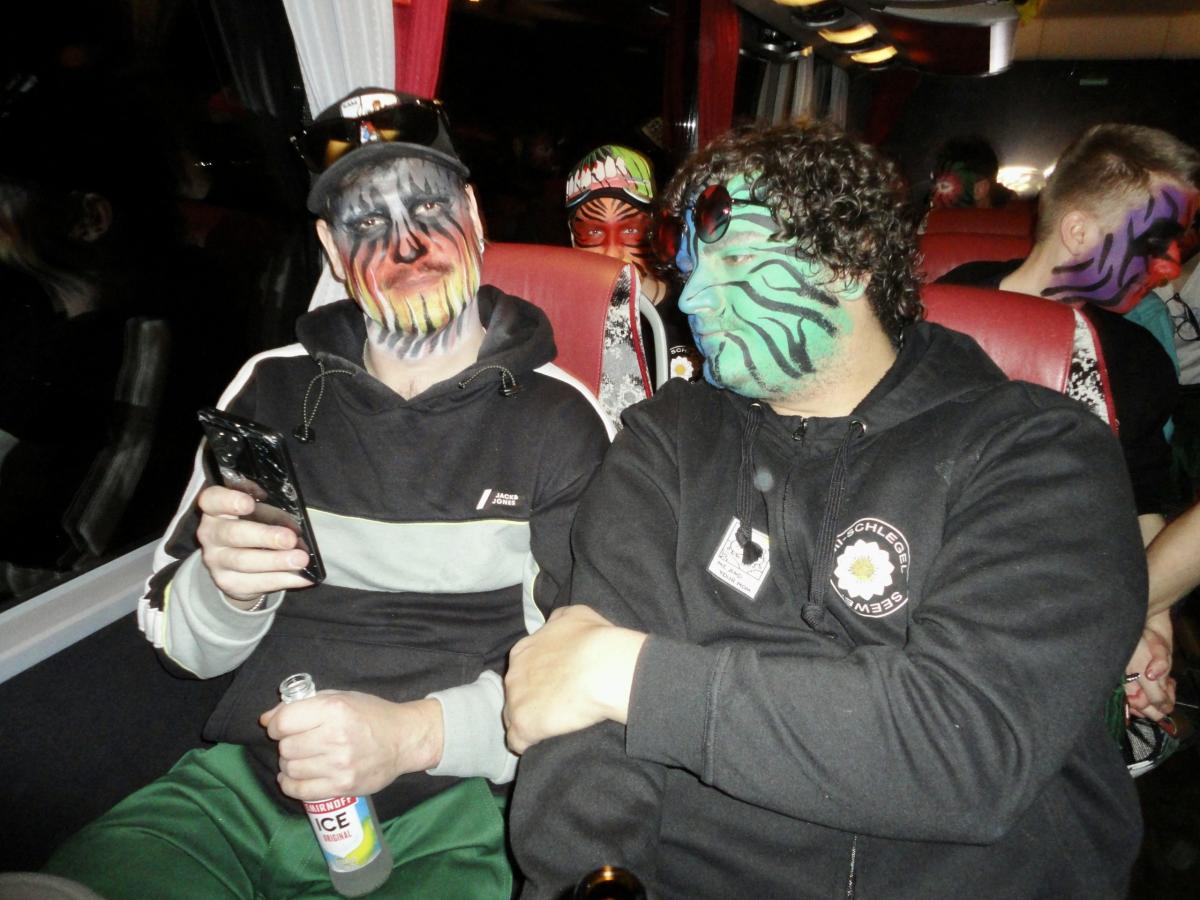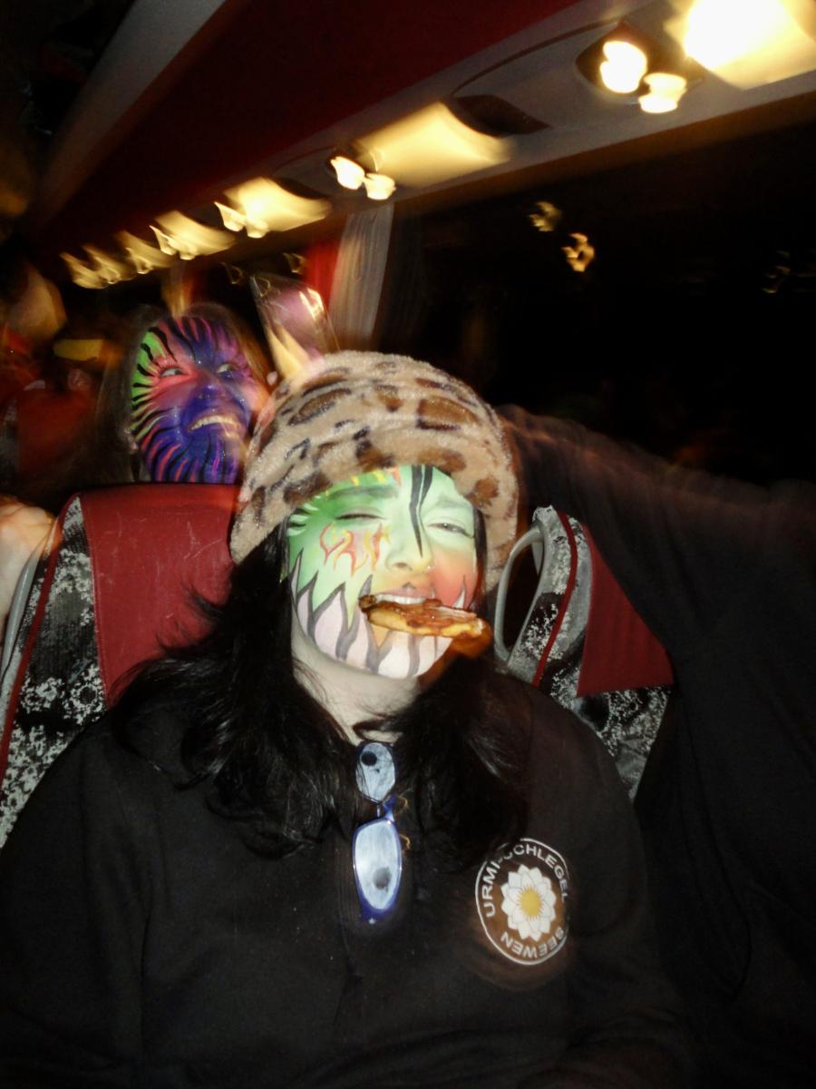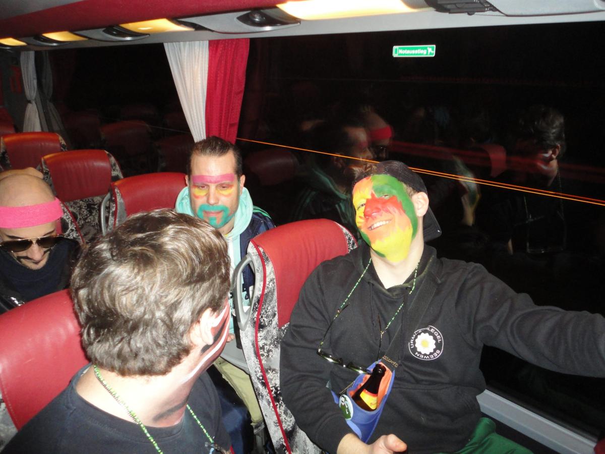 Das Urmi-Volk traf sich also früeh im Proberaum, versorge die Leber mit ordentlich Klang Wasser und schmierte sich mehr oder weniger euphorisch unsere geliebte Farbe in die Visage. «Wele Dubel hed erfunde das Guggene sich mönd Schminke?»