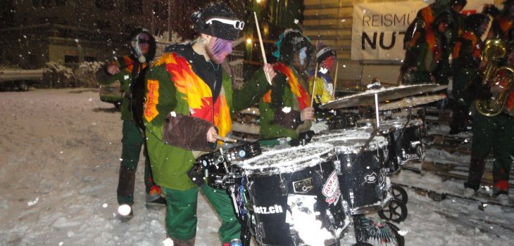 Auftritt 21:40 Uhr: Die Urmis kämpften tapfer gegen das eiskalte Schneegestöber. Sie trompeteten, trommelten und majorten was das Zeug hält. Doch beim heimischem Guggäpublikum war unser musikalisches Meisterwerk nur halb so laut wie sonst. Schuld war der starke Schneefall und sicher nicht nasse Lippen.