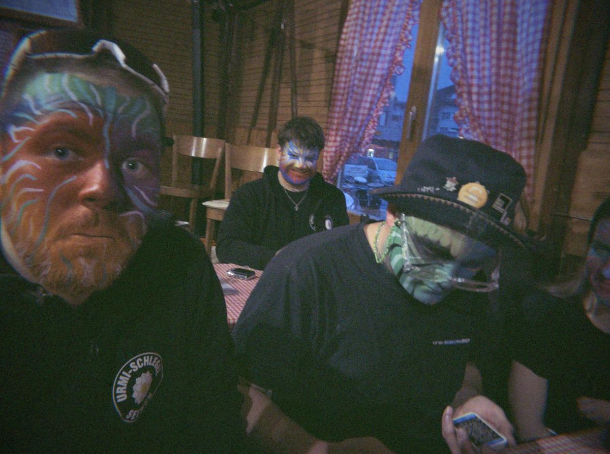 Nun teilte sich die Spreu vom Weizen. Während sich die einten ein weiziges Getränk genehmigten, verräumten andere pflichtbewusste Mitglieder die Instrumente. Die nassen Instrumente wurden sorgfältig im Proberaum versorgt und sauber zum Trocknen ausgelegt. Danach ist diese Delegation via Seebä (Grossfäld) nach Brunnen gefahren. Doch ein Urmi musste sich eingestehen, dass er noch nie mit einem Fröntler im Schneefall gefahren war. So blieb er auf dem untersten Parkplatz im Grossfeld stecken. Erst nachdem ein kluger Urmi ihn belehrte, er solle es doch rückwärts versuchen, konnte das bereits verloren geglaubte Fahrzeug sicher den Hügel hinauf manövriert werden.
