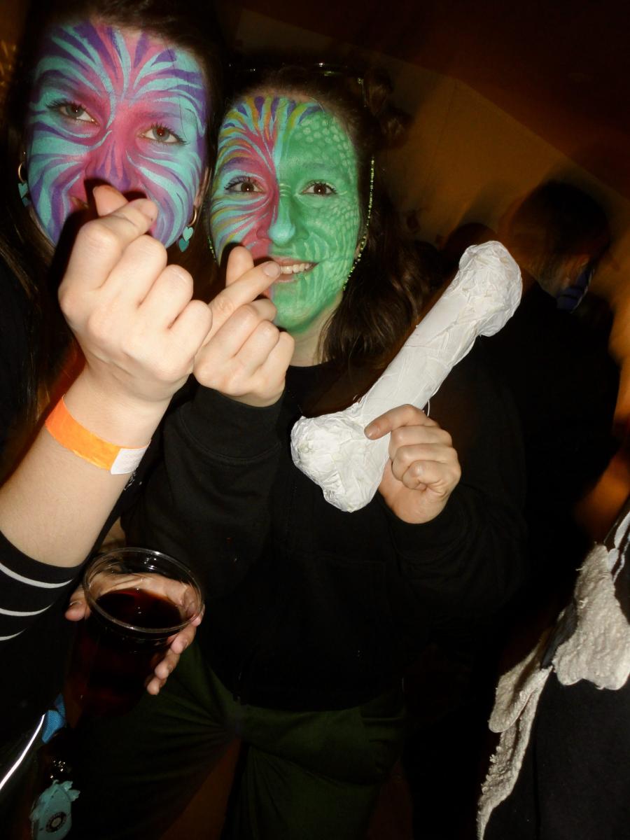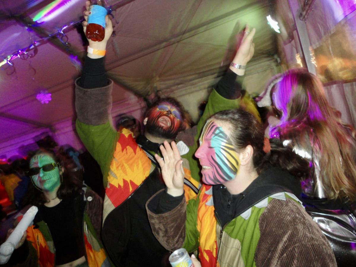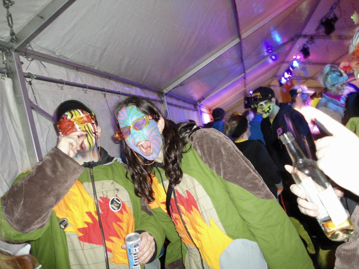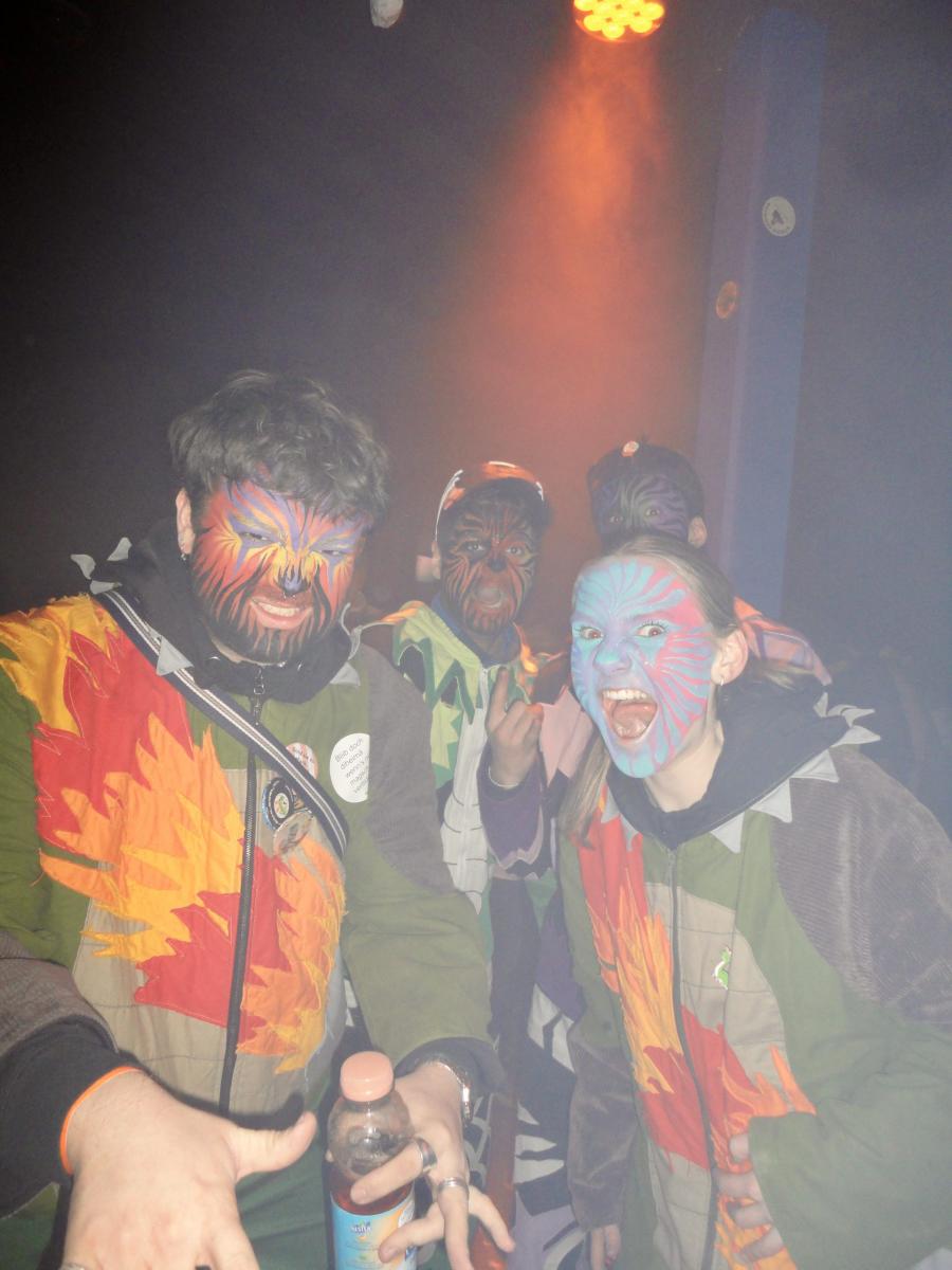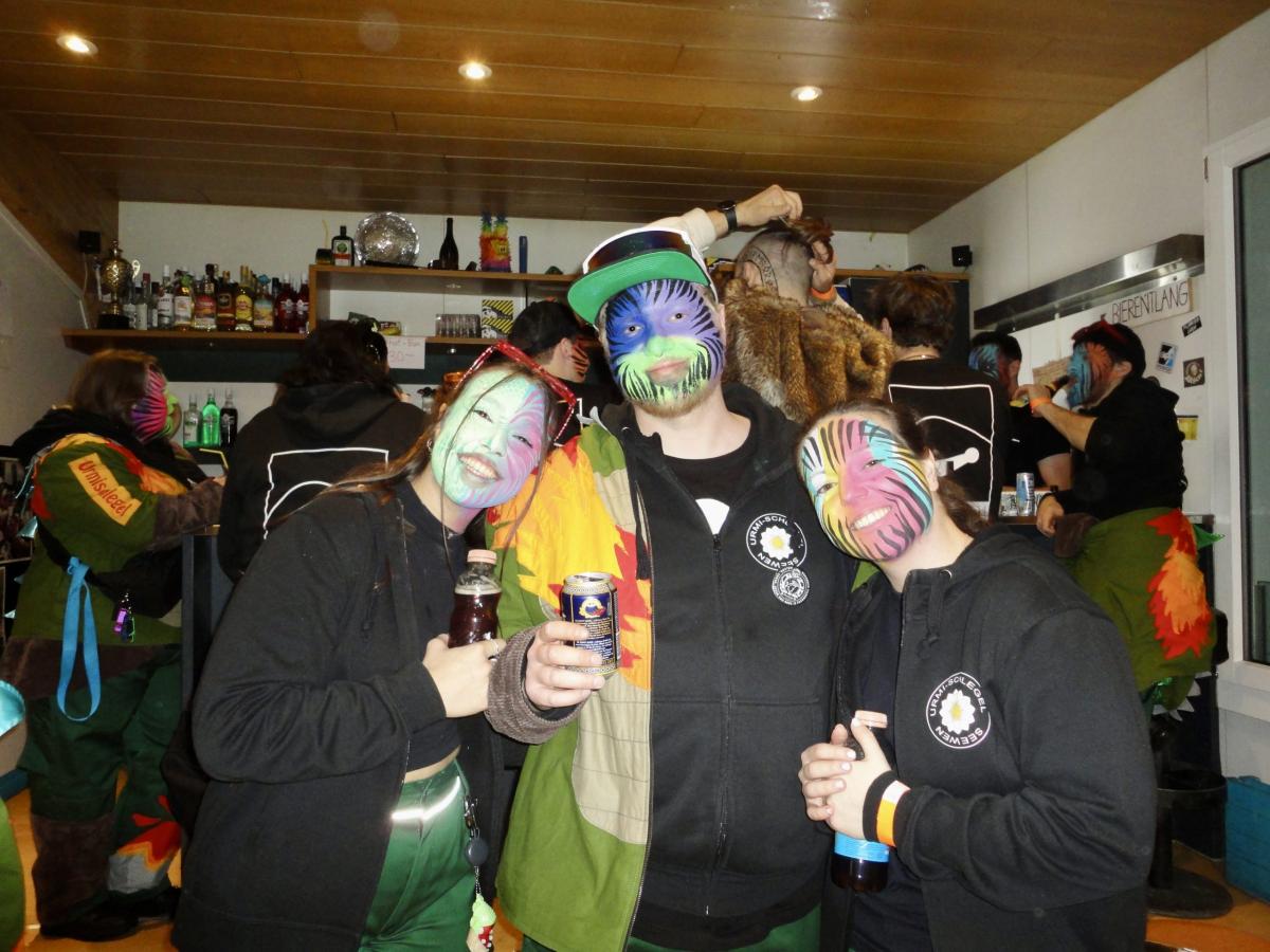 Es war einmal ein prächtiger Samstag im Februar und die Urmis machten sich bereit, um ein primitives Steinzeitfest aka den Gnomäball mit ihrer Anwesenheit zu erfreuen. Passend zum Motto musste sich die Urmi-Meute mittels des primitivsten Verkehrsmittels zum Christophorus-Schulhaus bewegen: auf den eigenen Füssen. Die lachenden Gesichter waren nach dem Schminken-Trinken im Proberaum kunstvoll bepinselt und die Kehlen löblicherweise gut benetzt.