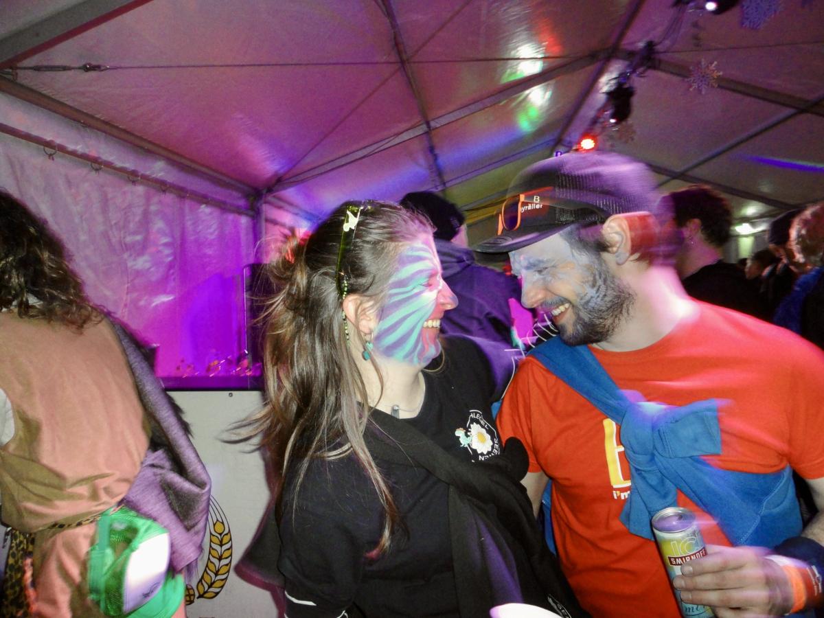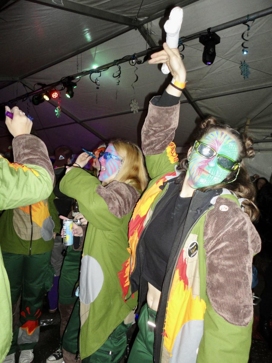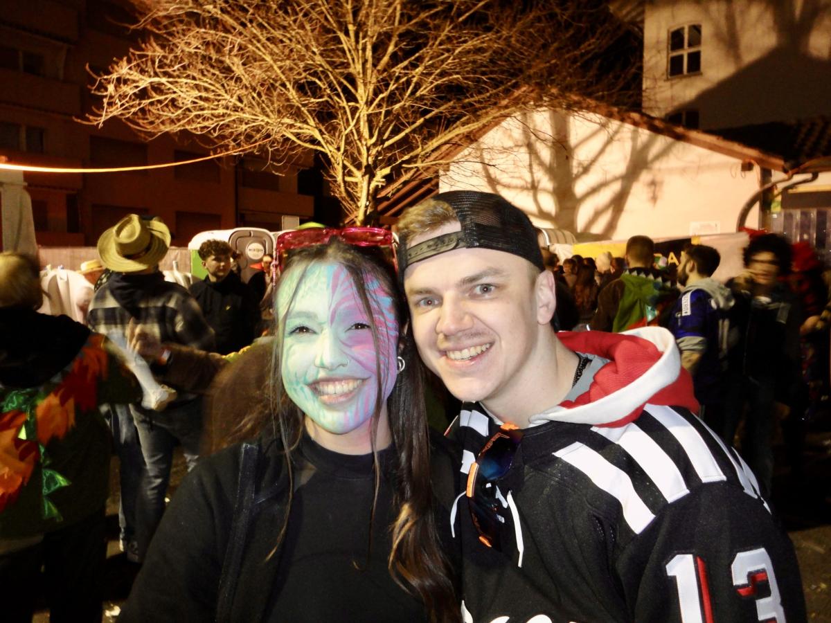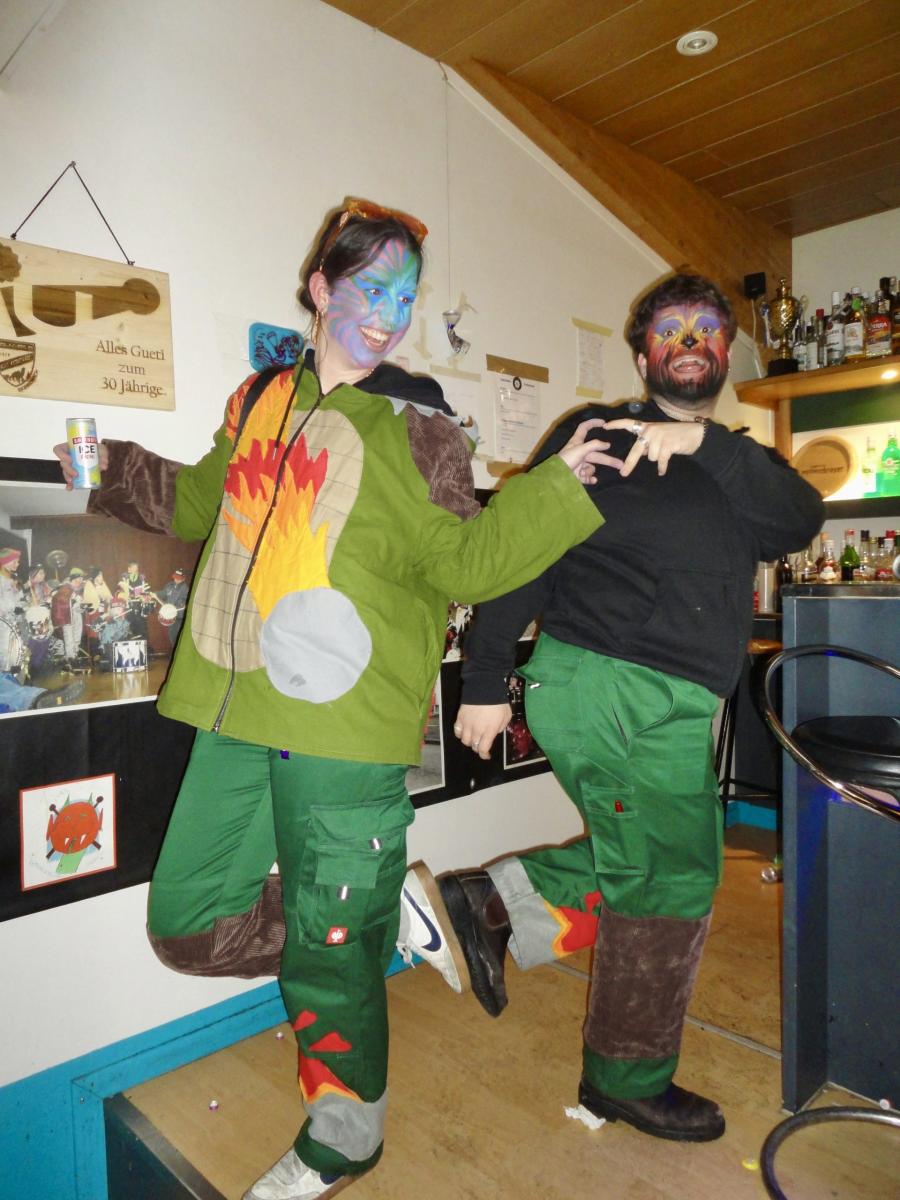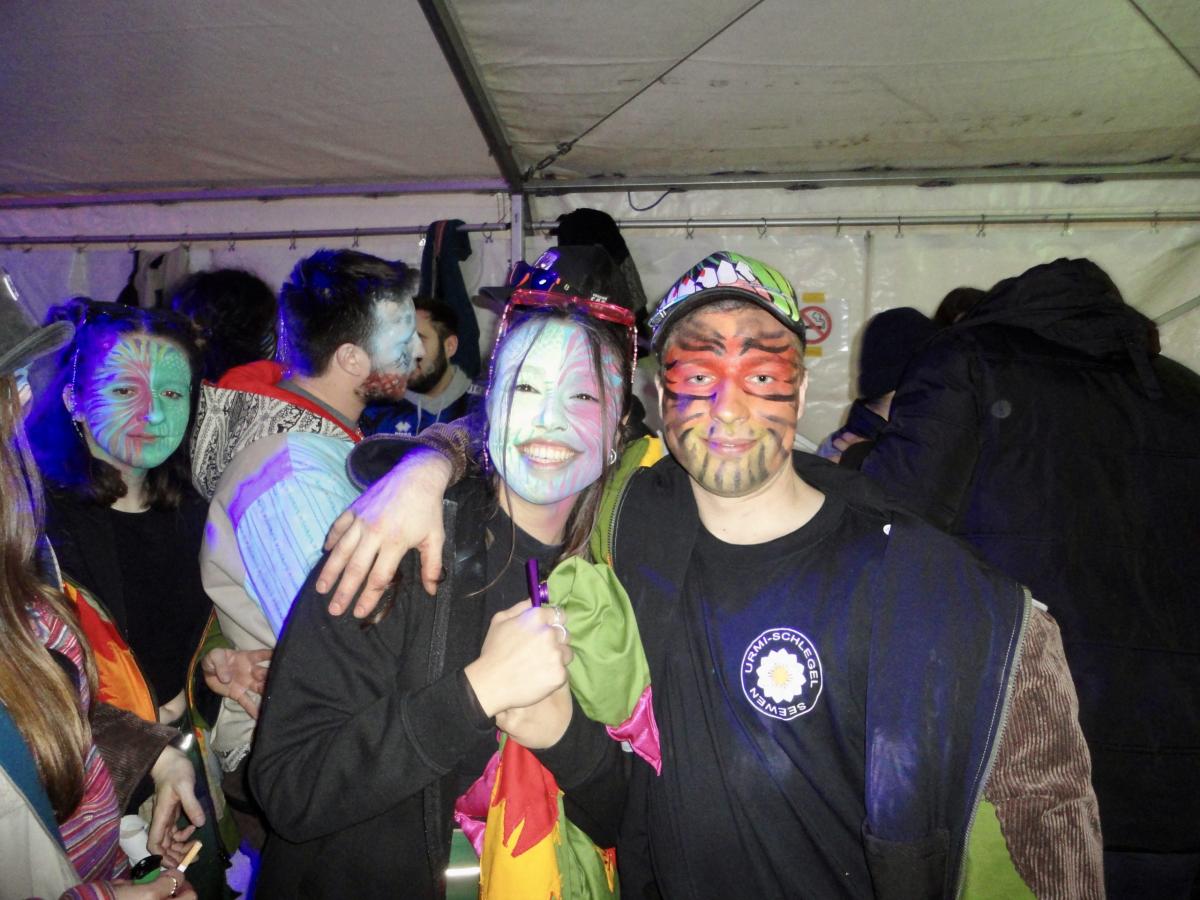 Auf der gar dunklen Muotastrasse machte sich die fasnächtliche Gruppe auf den Weg ans Fest, der Weg wurde gütigerweise vom Lichtschein aus dem ‘Knochen’ (boomerisch: Smartphone) unseres musikalischen Anführers S.G. erleuchtet. Gerade rechtzeitig erreichte die fröhliche Gruppe die Ansammlung der Festhöhlen. Kaum durch das Eingangstor eingezogen, wurden die musikalischsten aller Gastformationen bereits aufgefordert auf der Bühne eine erste Kostprobe ihres Könnens abzugeben. Die ersten leicht schrägen Töne des Börns erklangen durch die Nacht und lockten auch die letzten, sich erleichternden Trompetisten auf die Bühne. Nach einer Stärkung, um die Kälte besser zu überstehen und die Heiltränke besser zu ertragen, wurden die Festhöhlen durch die Urmis erobert. Allzu bald war es Zeit, dass sich die Urmis für einen weiteren Auftritt bereit machten. Gottlob waren alle Instrumente noch in der geheimen Instrumentenhöhle vorzufinden, gab es doch wiederum keine Möglichkeit diese bei den Organisatoren sicher unterzubringen. Vor dem Auftritt ergab sich noch ein schönes Wiedersehen zwischen zwei Urmidamen und zwei ihnen bekannten Heringen aus dem fernen Land der Tschifeler (Tschifeler, kurz Tschifi: Person, die aus Obwalden stammt). Nach einem weiteren grandiosen Auftritt, der die Festhöhle toben liess, machte sich die musikalische Meute auf den weiten und beschwerlichen Weg zurück in die heimische Probehöhle. Dort angekommen mussten die ausgedörrten Kehlen mit allerlei preiswerten Heiltränken befeuchtet werden. Auf dem Festgelände wurden die feierwütigen Urmis bereits schmerzlich vermisst und von einer trommelnden Stammeslegende L.K. zurückbeordert. Es folgten einige feuchtfröhliche Stunden: Personen (oder auch der ‘Knochen’ von C.W.) wurden vermisst, wiedergefunden und prompt wieder verloren, mehr oder weniger primitive Gespräche geführt, gelacht, getrunken, bhauptet und mit lebhaften Tänzen den Fasnachtsgöttern gehuldigt. Die Erinnerungen der Chronistin an diese wilden Stunden sind bunt, etwas verwackelt, geprägt von diversen lustigen Begegnungen. Allzu schnell erklangen schon die legendären Töne des letzten Tanzes und einige unverwüstliche Urmis und auserlesene stammesfremde Personen machten sich auf den Weg, um in der Urmi-Probehöhle den Abend ausklingen zu lassen. Alle anwesenden Tims schlossen sich zum Dreamteam Tim zusammen und ein weiblicher Urmi fand sich auf der Suche nach einem bequemen Ruheplatz in einer gar ungewöhnlichen Kleinsthöhle wieder. Aber damit nicht genug, da ihr Fusswerk durchnässt wurde, mussten kurzerhand rezyklierte Papuče angefertigt werden. Als die Müdigkeit bei den jüngsten Musikantinnen zu gross wurde, musste auch dieses ausgelassene Fest beendet werden. Die härtesten der harten Urmis marschierten zu Fuss in ihre Heimathöhlen, andere wurden durch einen motorisierten Rufkarren, fachmännisch organisiert durch J.R., sicher in ihre warmen Fellbetten geleitet. Frisch ausgeruht freut sich die gesamte Urmi-Meute auf eine grandiose Fasnachtswoche 2026!