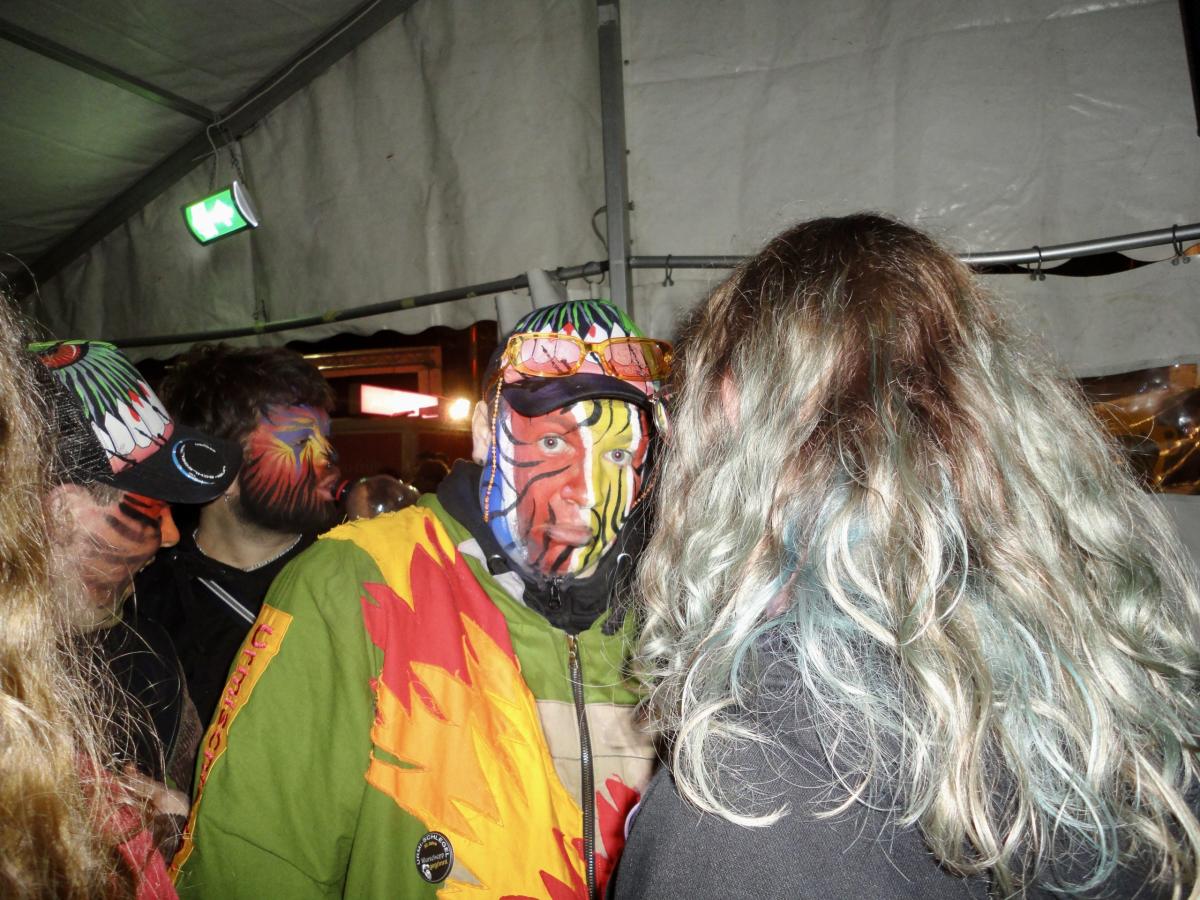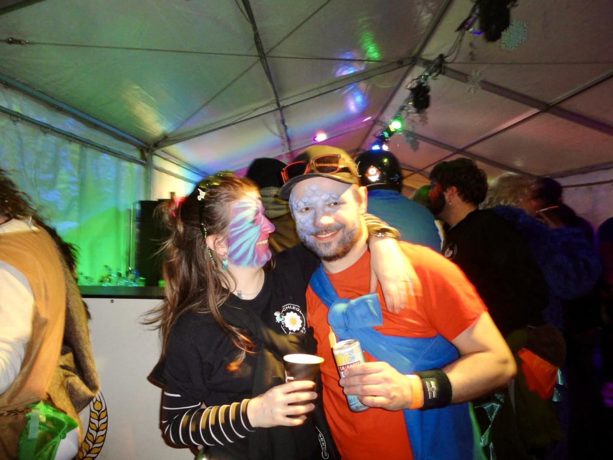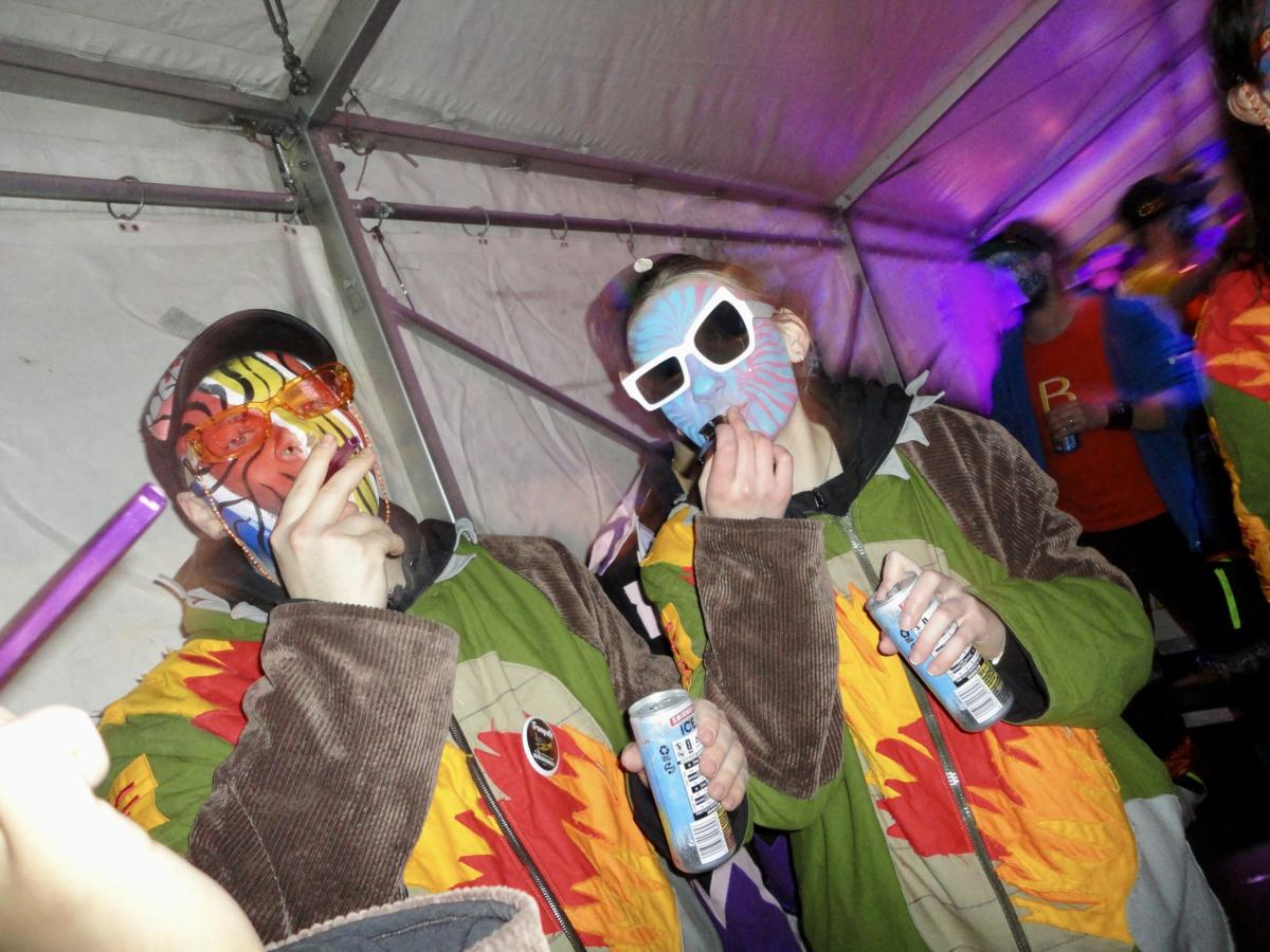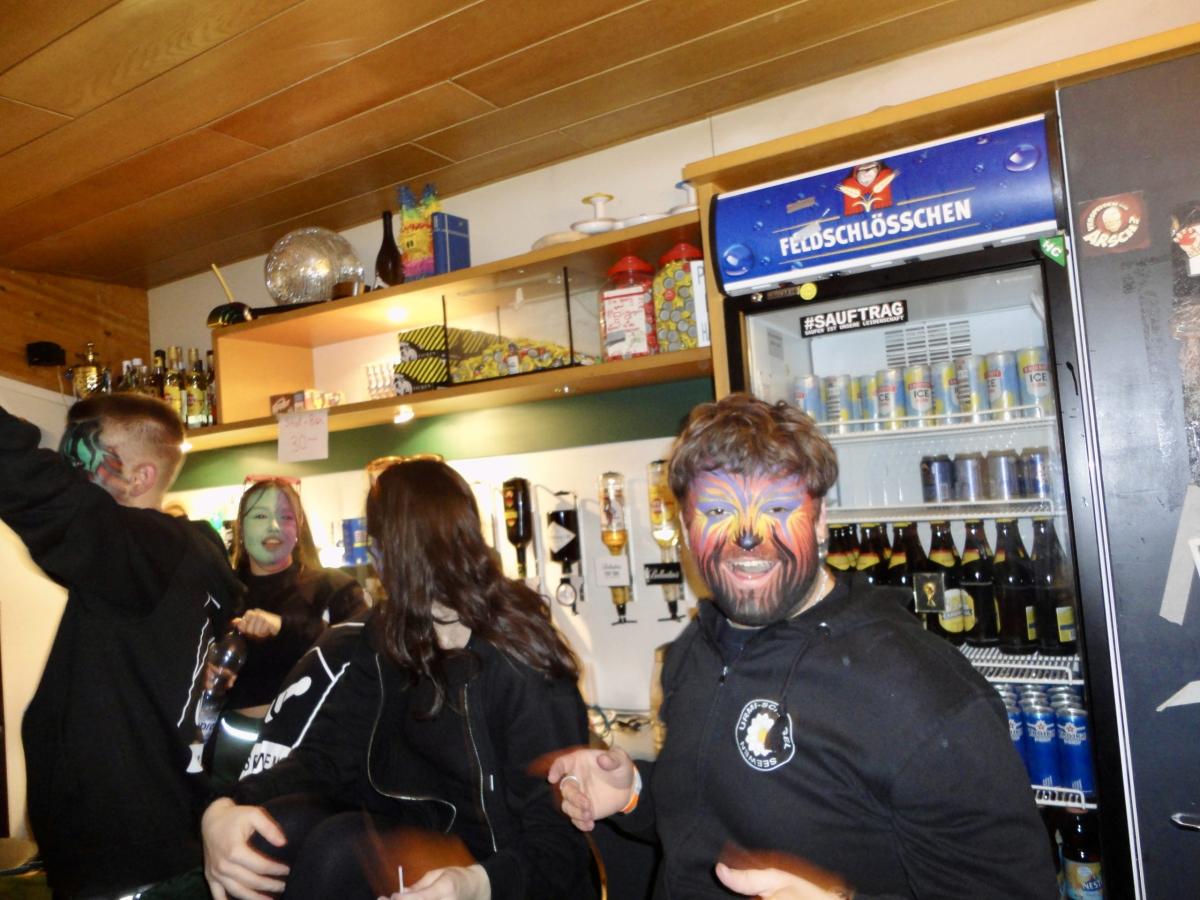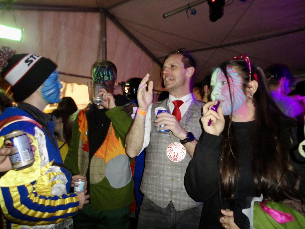 Auf der gar dunklen Muotastrasse machte sich die fasnächtliche Gruppe auf den Weg ans Fest, der Weg wurde gütigerweise vom Lichtschein aus dem ‘Knochen’ (boomerisch: Smartphone) unseres musikalischen Anführers S.G. erleuchtet. Gerade rechtzeitig erreichte die fröhliche Gruppe die Ansammlung der Festhöhlen. Kaum durch das Eingangstor eingezogen, wurden die musikalischsten aller Gastformationen bereits aufgefordert auf der Bühne eine erste Kostprobe ihres Könnens abzugeben. Die ersten leicht schrägen Töne des Börns erklangen durch die Nacht und lockten auch die letzten, sich erleichternden Trompetisten auf die Bühne. Nach einer Stärkung, um die Kälte besser zu überstehen und die Heiltränke besser zu ertragen, wurden die Festhöhlen durch die Urmis erobert. Allzu bald war es Zeit, dass sich die Urmis für einen weiteren Auftritt bereit machten. Gottlob waren alle Instrumente noch in der geheimen Instrumentenhöhle vorzufinden, gab es doch wiederum keine Möglichkeit diese bei den Organisatoren sicher unterzubringen. Vor dem Auftritt ergab sich noch ein schönes Wiedersehen zwischen zwei Urmidamen und zwei ihnen bekannten Heringen aus dem fernen Land der Tschifeler (Tschifeler, kurz Tschifi: Person, die aus Obwalden stammt). Nach einem weiteren grandiosen Auftritt, der die Festhöhle toben liess, machte sich die musikalische Meute auf den weiten und beschwerlichen Weg zurück in die heimische Probehöhle. Dort angekommen mussten die ausgedörrten Kehlen mit allerlei preiswerten Heiltränken befeuchtet werden. Auf dem Festgelände wurden die feierwütigen Urmis bereits schmerzlich vermisst und von einer trommelnden Stammeslegende L.K. zurückbeordert. Es folgten einige feuchtfröhliche Stunden: Personen (oder auch der ‘Knochen’ von C.W.) wurden vermisst, wiedergefunden und prompt wieder verloren, mehr oder weniger primitive Gespräche geführt, gelacht, getrunken, bhauptet und mit lebhaften Tänzen den Fasnachtsgöttern gehuldigt. Die Erinnerungen der Chronistin an diese wilden Stunden sind bunt, etwas verwackelt, geprägt von diversen lustigen Begegnungen. Allzu schnell erklangen schon die legendären Töne des letzten Tanzes und einige unverwüstliche Urmis und auserlesene stammesfremde Personen machten sich auf den Weg, um in der Urmi-Probehöhle den Abend ausklingen zu lassen. Alle anwesenden Tims schlossen sich zum Dreamteam Tim zusammen und ein weiblicher Urmi fand sich auf der Suche nach einem bequemen Ruheplatz in einer gar ungewöhnlichen Kleinsthöhle wieder. Aber damit nicht genug, da ihr Fusswerk durchnässt wurde, mussten kurzerhand rezyklierte Papuče angefertigt werden. Als die Müdigkeit bei den jüngsten Musikantinnen zu gross wurde, musste auch dieses ausgelassene Fest beendet werden. Die härtesten der harten Urmis marschierten zu Fuss in ihre Heimathöhlen, andere wurden durch einen motorisierten Rufkarren, fachmännisch organisiert durch J.R., sicher in ihre warmen Fellbetten geleitet. Frisch ausgeruht freut sich die gesamte Urmi-Meute auf eine grandiose Fasnachtswoche 2026!