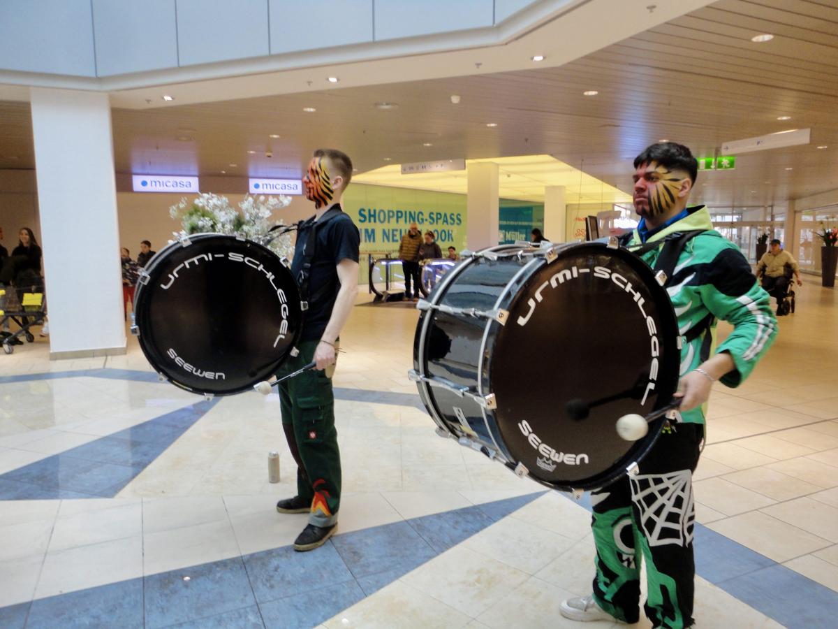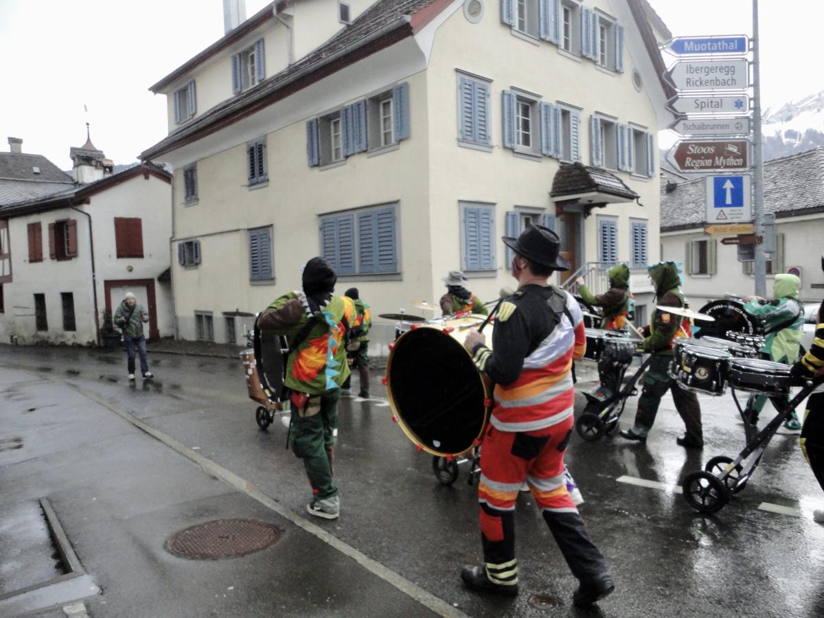 Nach zwei gelungenen Center-Auftritten war es an der Zeit, nach Schwyz zu gässeln. Erster Stopp: Mill/Bären. Da warteten schon einige Ex-Urmis auf uns, welche uns an diesem Tag begleiteten. Nach einem kurzen Auftritt konnte auch endlich mit der Pegelaufbauphase begonnen werden, wichtig um Verletzungen (im Fachjargon auch «Unterhopfungen» genannt) vorzubeugen.
