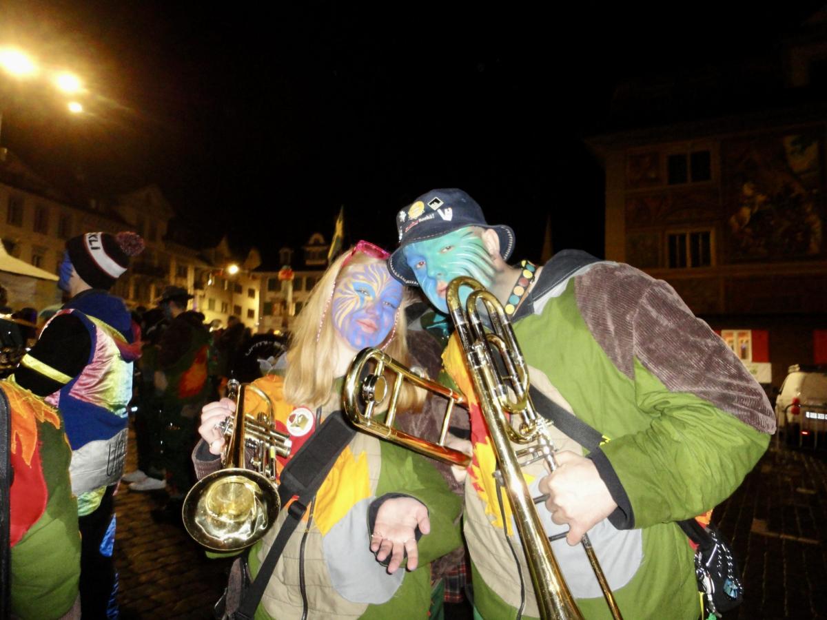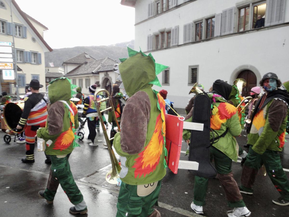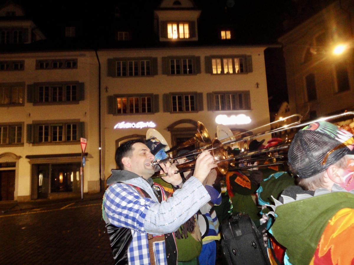 Nun war es so weit: Das grosse Finale des heutigen Tages stand auf dem Spielplan: das Harus. In einem abwechselnden Pingpong Konzert spielten die drei Guggen auf dem Hauptplatz. Drei Guggen? Waren es sonst nicht immer vier? Absolut richtig, scheinbar musste die vierte Gugge aus Ibach Forfait geben oder sie haben den Weg nicht gefunden. So oder so tat der Moderator bestens seine Pflicht und liess die Zuschauer immer wieder wissen, dass eine Gugge fehlt.